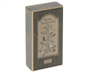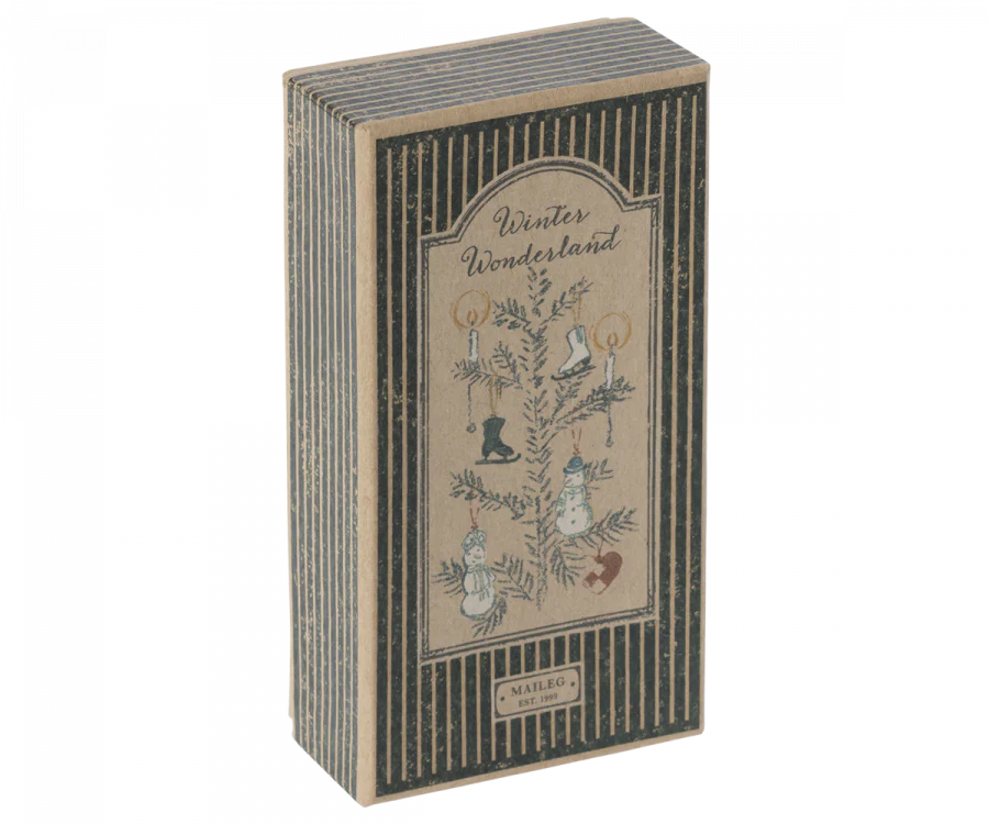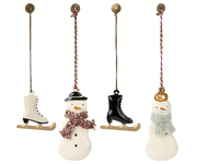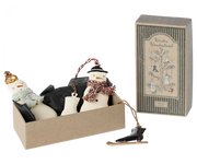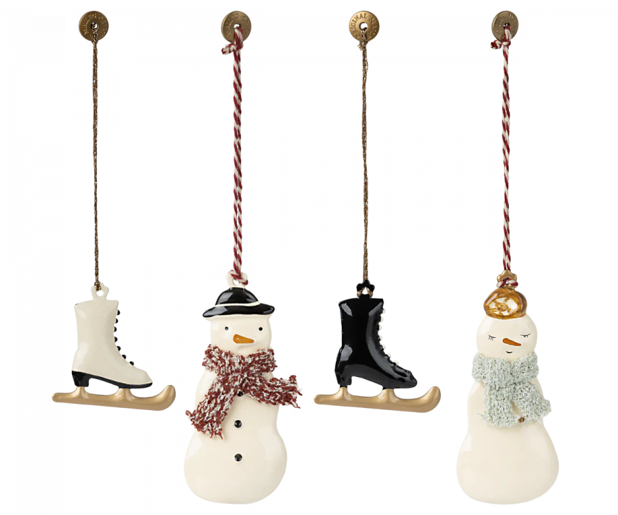 A perfect gift box containing 4 beautiful Maileg ornaments. Each ornament is wrapped in tissue paper and packed in a gift box decorated with Dorte Mailil's drawings. This set contains a snowman, his wife and 2 skates