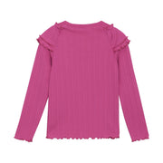 Fuchsia ribbed long sleeve tee with ruffle detailing on the shoulders. A basic that pairs with any style bottom.