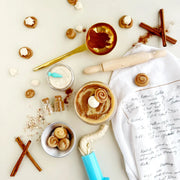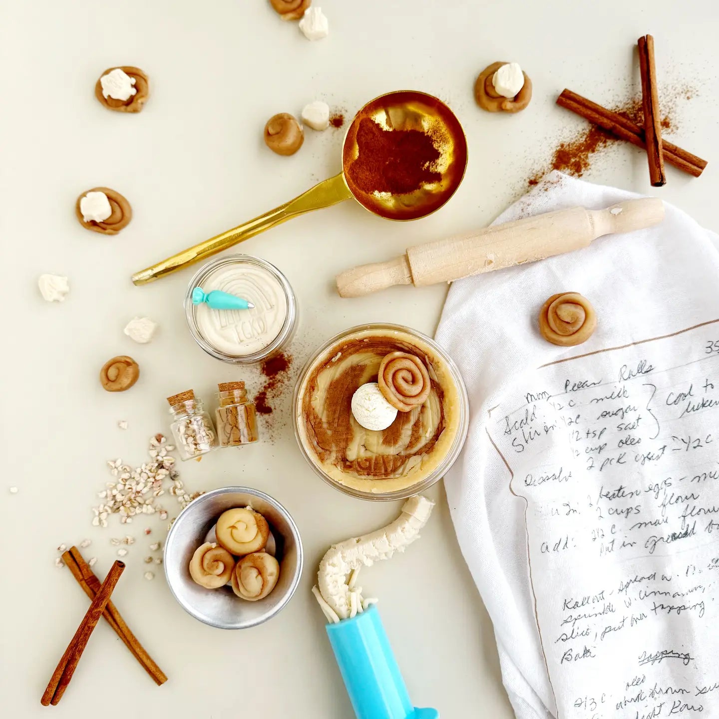 Making pretend cinnamon rolls has never looked, felt, and smelled so real! This Cinnamon Roll KidDough Play Kit is the perfect way to express their cooking creativity with imaginative baking play. Roll out the holiday fun! Includes: 8 oz jar of Cinnamon Roll Scented KidDough, 2 oz jar of White (Vanilla Buttercream) KidDough for Frosting, Wood Rolling Pin, Baking Pan, Frosting Exturder, Piping Bag Charm, Jar of Cinnamon, Jar of Faux Nuts, Butter Charm, Convenient Resealable Storage Bag Our super silky sensory doughs are buildable like a modeling compound however they are softer, more pliable, and far longer lasting than any you have tried before! Every all-natural KidDough is made with non-toxic food grade ingredients and is totally taste safe. KidDough is the best way to play dough! Handmade in the USA This Play Kit is recommended for Ages 3+ Ingredients: Wheat Flour, Salt, Canola Oil, Cream of Tartar, Water, Food Coloring, Organic Potassium Sorbate, and Natural Fragrance