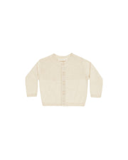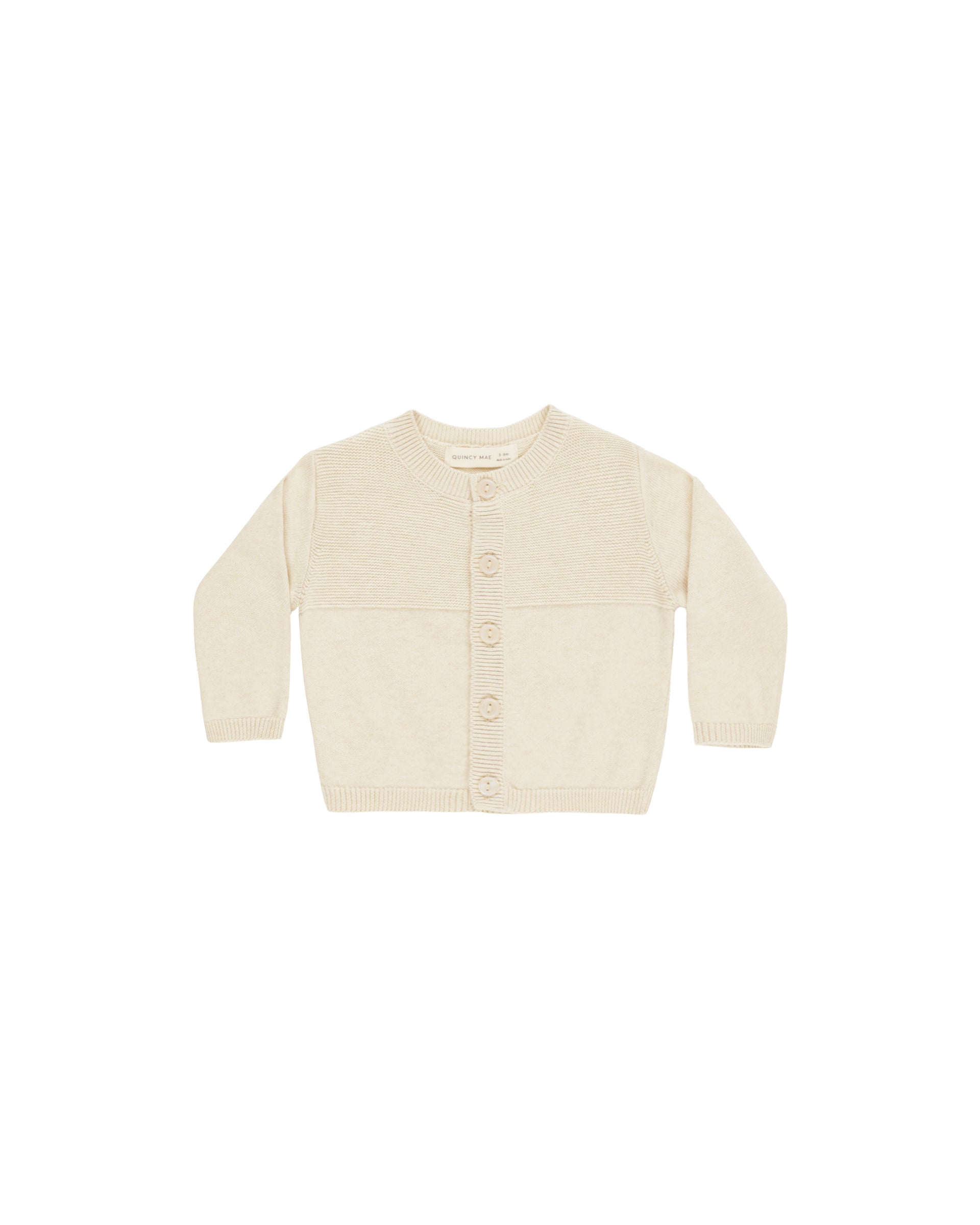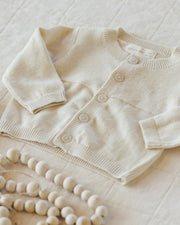 Our Knit Cardigan features a charming contrast knit design, with ribbing at the neck, wrists, and waist, with faux shell buttons for an extra sweet touch. Pair with our Knit Pant to complete your little one's look. Featuring our ‘heathered natural’ hue. Care: Machine wash cold. Lay flat to dry. Made of 100% Organic Cotton.