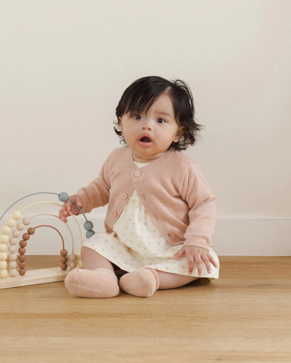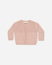 Our Knit Cardigan features a charming contrast knit design, with ribbing at the neck, wrists, and waist, with faux shell buttons for an extra sweet touch. Pair with our Knit Pant to complete your little one's look. Featuring our ‘heathered rose’ hue. Care: Machine wash cold. Lay flat to dry. Made of 100% Organic Cotton.