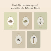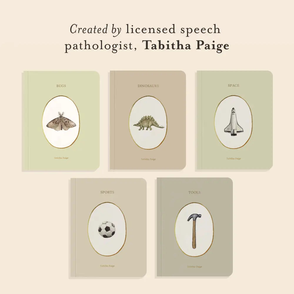 Designed by a professional watercolor artist and licensed speech therapist, Our Little Library Vol. 3 features charming watercolor illustrations and foundational first words that will help you build your child's vocabulary. The durable materials and small book size also make them perfect for your baby's little hands. Five board books feature foundational words in these categories:   • Sports   • Space   • Dinosaurs   • Tools   • Bugs  The back of each book in this first words box set also includes a "seek and find" activity to help parents encourage their little ones to learn to identify the pictures on the page. Created by speech therapist Tabitha Paige, M.S., CCC-SLP, author of the bestselling box sets Our Little Adventures and Our Little Library, this new box set of first words books features functional language and a timeless design that will look great in any nursery or child's room.