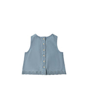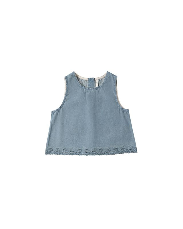 This sleeveless cropped a-line top is the perfect mix of stylish and playful. Featuring a scalloped edge with eyelet detail and button back opening.