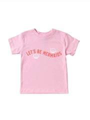 Let's be Mermaids with Clamshells Features & Sizing *Crewneck, pullover styling *Short sleeves *Two color Print Materials & Care *Soft Feel *100% Cotton - Pink *58% Cotton and 48% Polyester - Heather Mauve *50% polyester, 25% combed and ring spun cotton, 25% rayon - Ice Blue and Peach *Machine wash cold, dry flat *Iron inside out