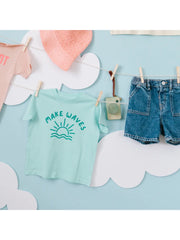 Make Waves Summer Tee! Features & Sizing *Crewneck, pullover styling *Short sleeves * Teal or Brown Print Materials & Care *Soft Feel *100% Cotton - Natural *50% polyester, 25% combed & ringspun cotton, and 25% rayon - Peach and Ice Blue *Machine wash cold, dry flat *Iron inside out