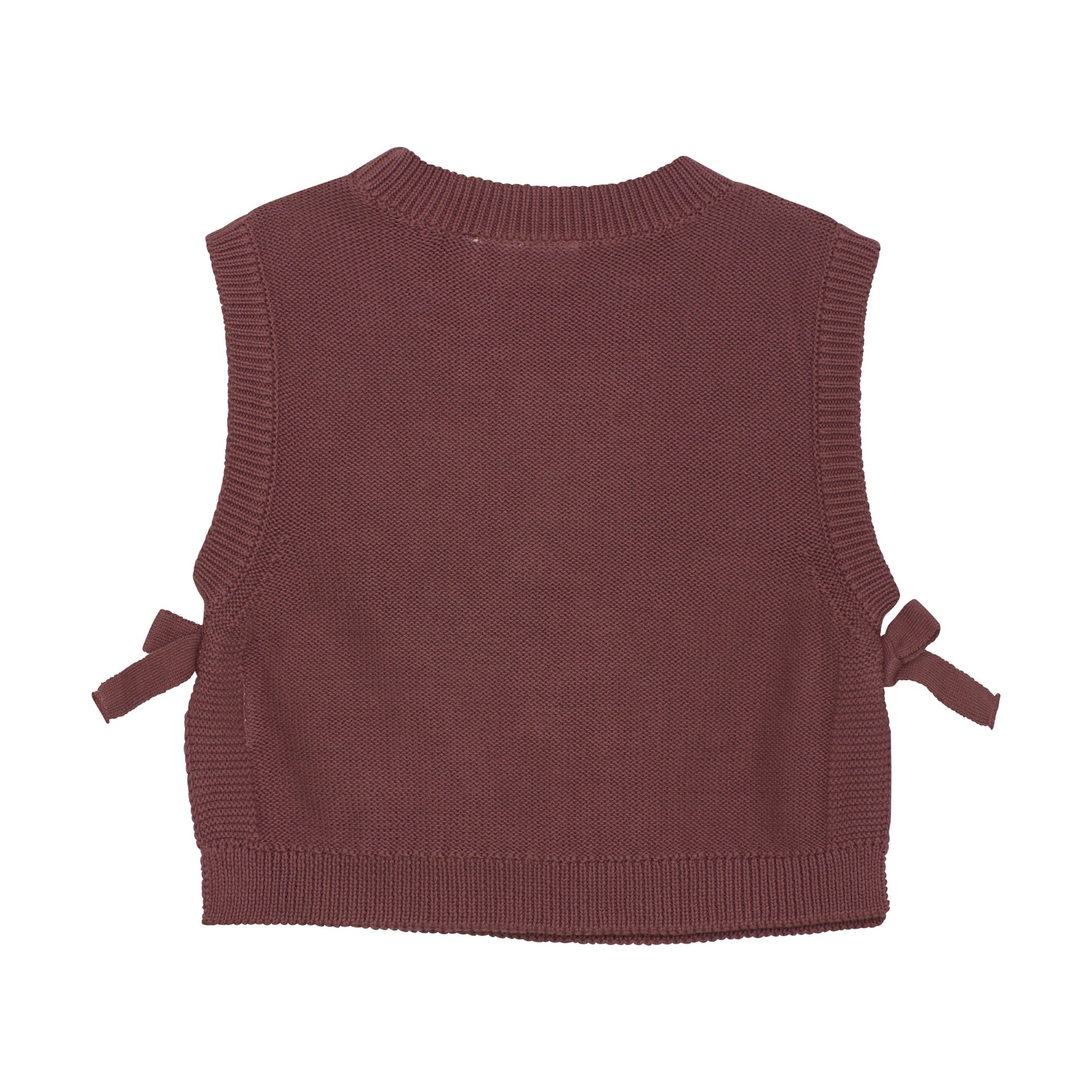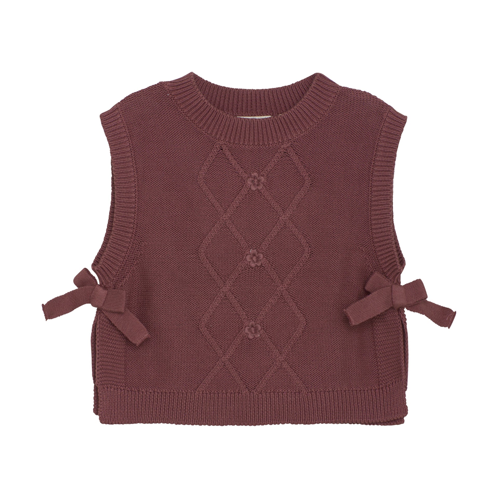 Rose knit vest with floral embroidered details & a cross pattern down the middle, and ties on the sides. Style over a solid tee with some wide leg bottoms for a complete outfit.
