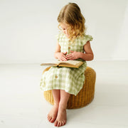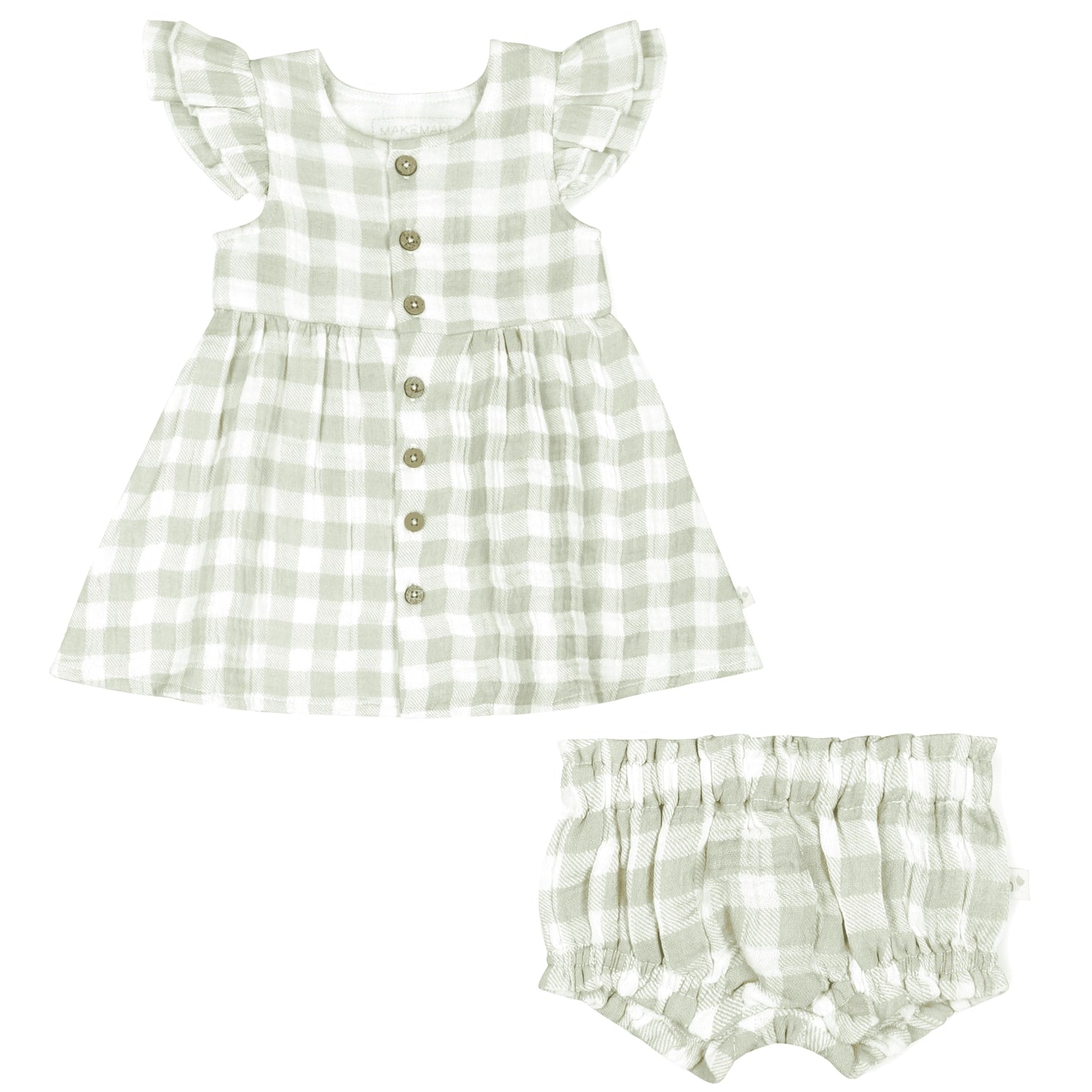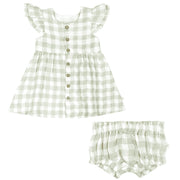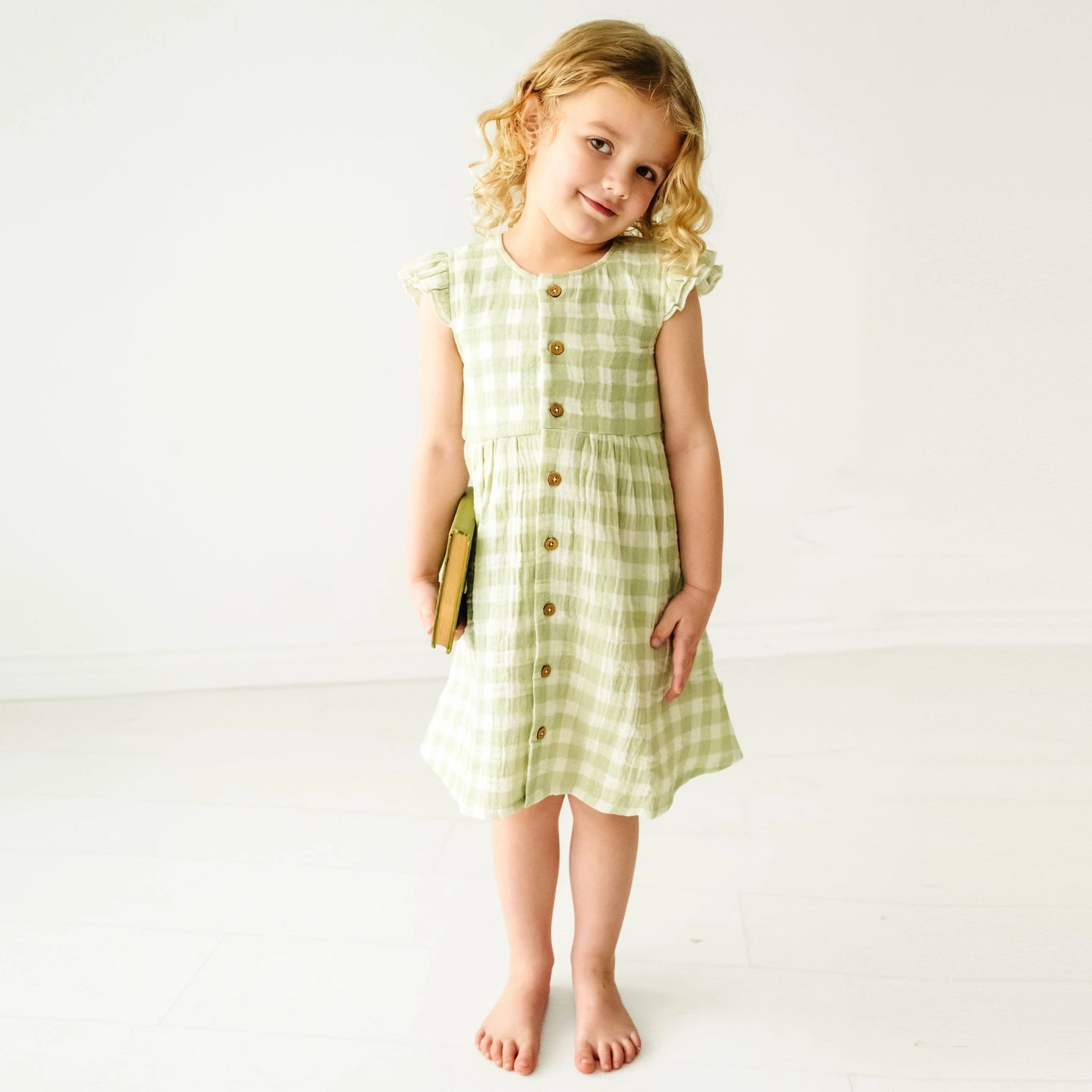 A soft and airy muslin masterpiece, our Flutter Dress brings comfort and cuteness. Its fluttery sleeves add a special flair, and wooden buttons make getting dressed a breeze. We've got a variety of colors and prints to choose from, so your cutie will look and feel their best! Comes with matching bloomer for sizes up to 24M.