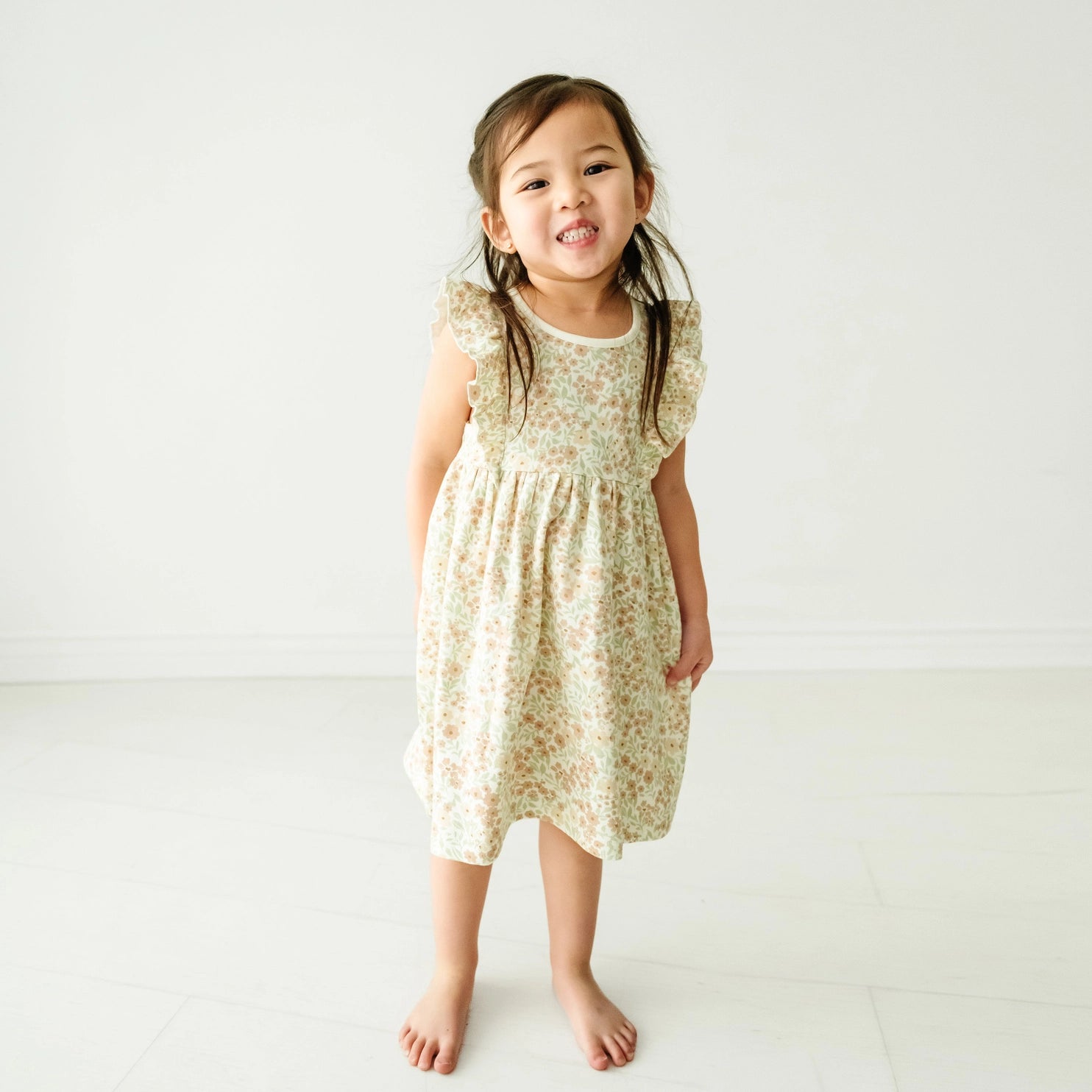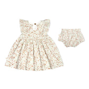 With a dash of poise and a splash of creativity, this gorgeous classic flutter dress is unique and remarkable! This classic dress is made from the most amazing organic fabric, and the playful details will make any baby girl's wardrobe burst with joy! A soft and airy muslin masterpiece, our Flutter Dress brings comfort and cuteness. Its fluttery sleeves add a special flair, and wooden buttons make getting dressed a breeze. We've got a variety of colors and prints to choose from, so your cutie will look and feel their best! Comes with matching bloomer for sizes up to 24M.