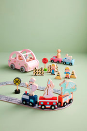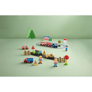 12-piece set includes four wooden construction vehicles, two road blocks, two workers, two road signs and two cones. Ages 3+