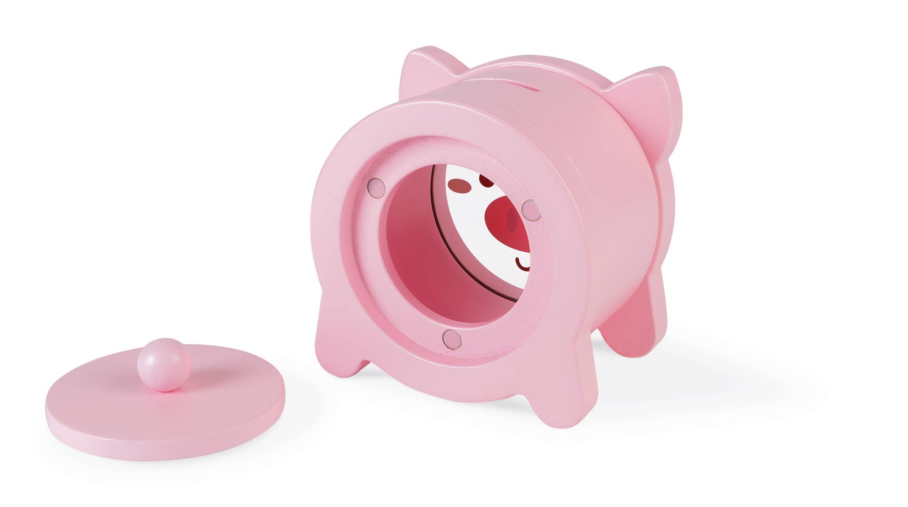 Wooden product An attractive piggybank to save coins and bills throughout the year. Your child will see them through the transparent part in front. And the magnetic opening located at the back makes it easy to recover them. It will make it fun to save up! Closed color box