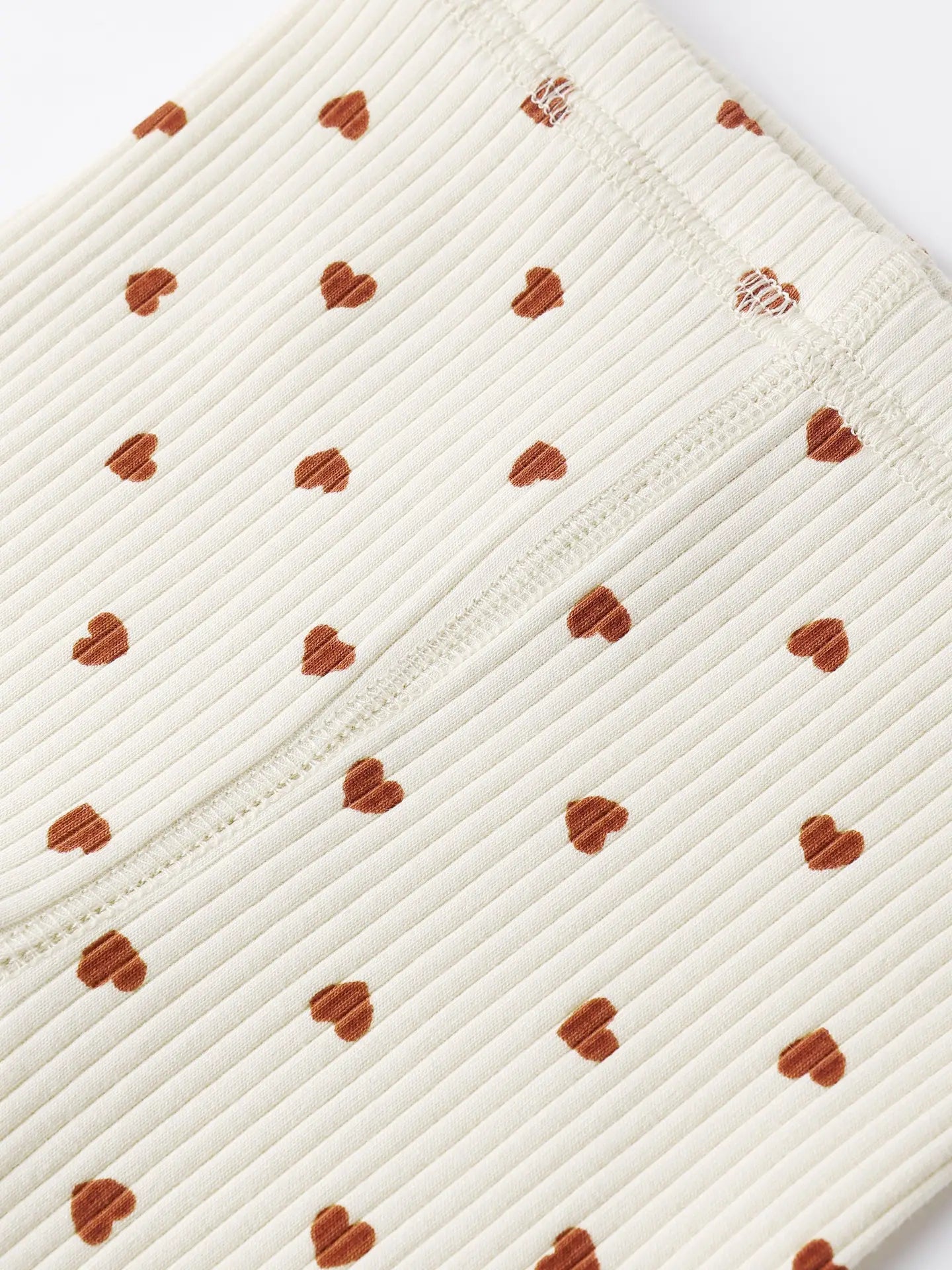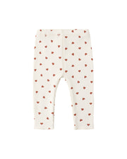 Knit legging in our stretchy rib knit with elastic waistband. Slim fit with added stretch to grow with your baby. Featuring our 'red hearts' print on our ‘natural' hue. Care: Machine wash cold. Lay flat to dry. Made of 95% organic cotton / 5% elastane.