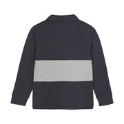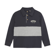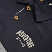 This trendy polon is full of details with the embroidered 'adventure', brown buttons, the collar, and the grey stripe across the middle. Pair with some loose wide leg pants for a fun trendy look or a pair of sweats for a playful outfit.