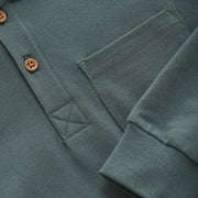 Long sleeve green knit polo with a collar and brown button details. Perfect for school photos, family photos and all of the Holiday festivities!