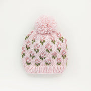 Elevate baby's wardrobe with our Bitty Blooms Blush Pink Beanie Hat. Boasting a design adorned with delicate rosy pink flowers and mossy green leaves, this hat is complete with a fluffy matching pom pom. For a charming coordinated look, pair it with our matching cardigan sweater. Each hat is partially knit from recycled, sustainable Polyester yarn made from plastic bottles. We are on a mission to help reduce the world's plastic pollution problem ♻ • Hand Knit • 60% Acrylic, 40% Recycled Polyester • Hand Wash • Designed in our Coachella Valley, CA studio