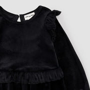 Soft, warm and stylish this long-sleeved dress is made from a chic black velour and is perfect for special occasions. With flutter trim over each sleeve and along the waist, it has a pretty style while looking sophisticated and elegant. The loop button at the back ensures over-the-head dressing is easy and fuss free while keeping the front looking sleek and refined. With a flowy skirt, she’ll love twirling her way through the day.