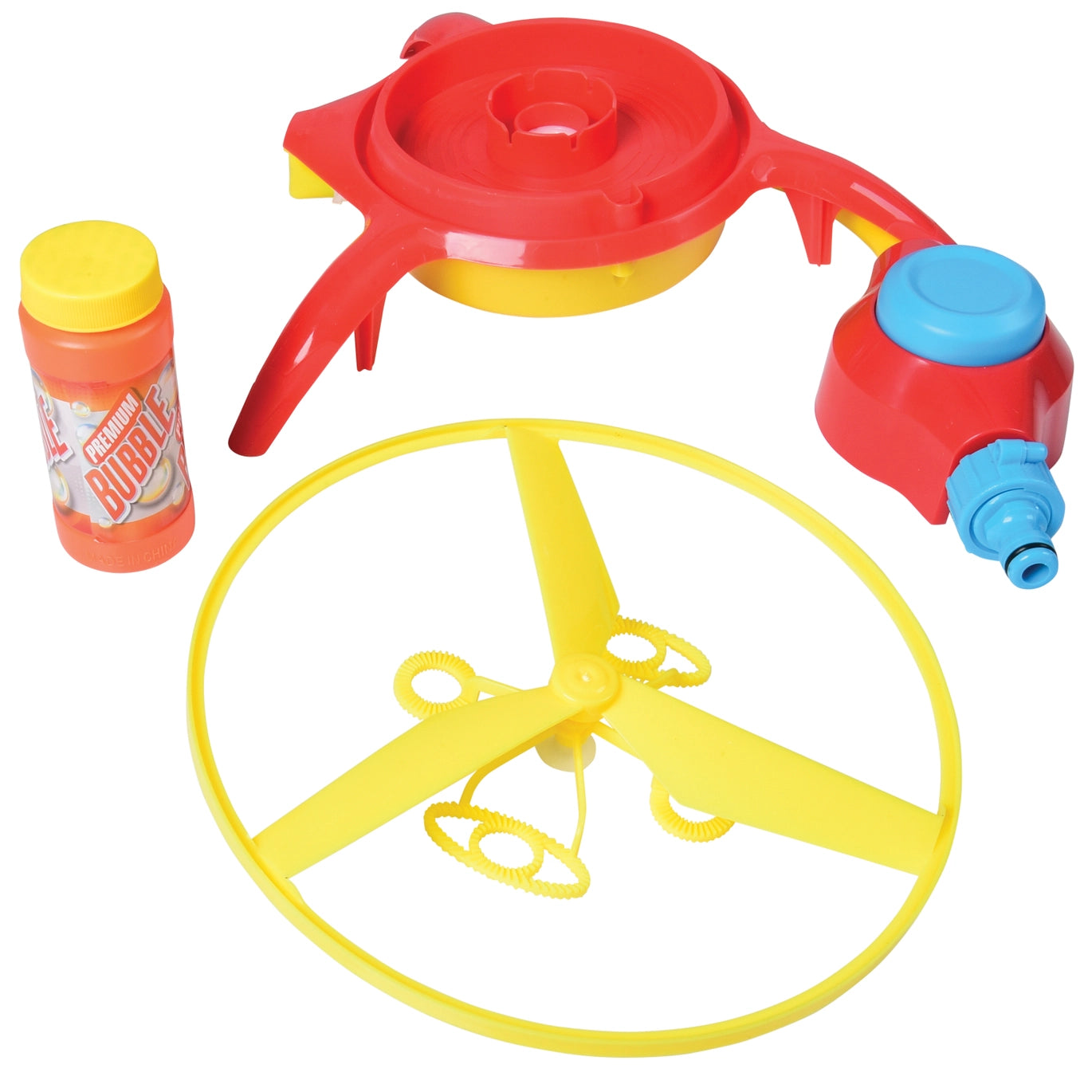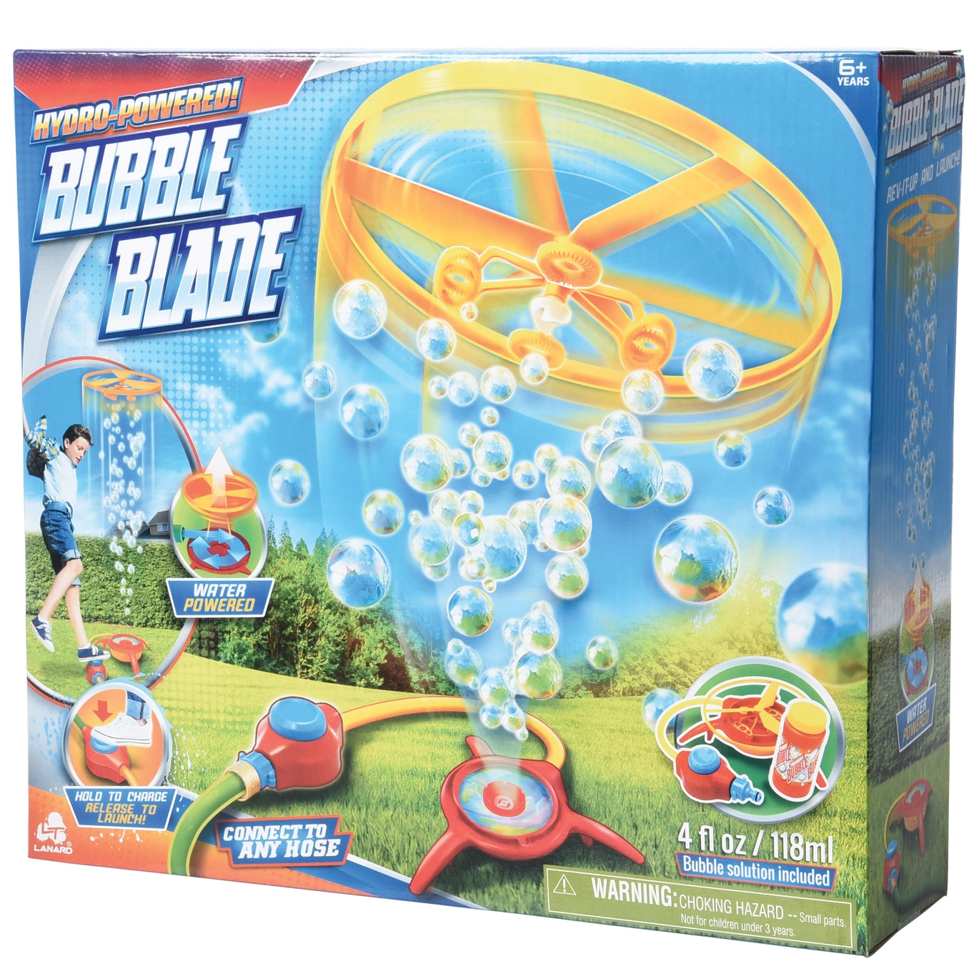 Connect to ordinary garden hose, step on controller to charge and release to launch bubble blade. Launches up to 20 feet. Comes in case pack of 4 units. Colorful packaging for in store merchandising. Key Seasons & Features: Summer Toy, Summertime Toy, Outdoor toy, flying toy, bubble toy.
