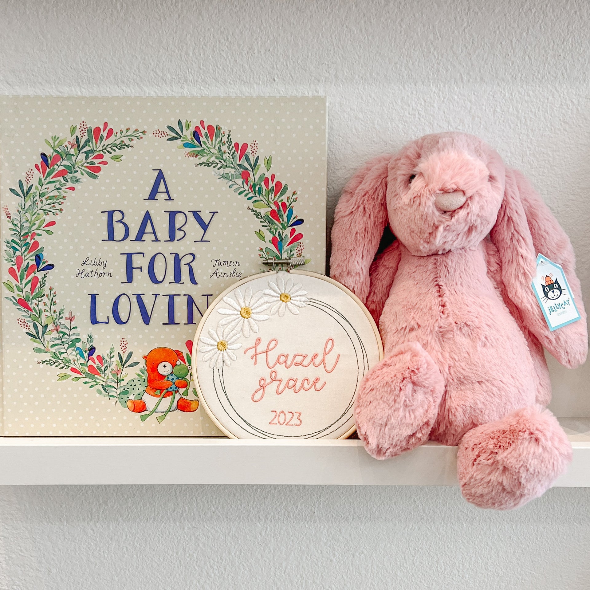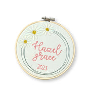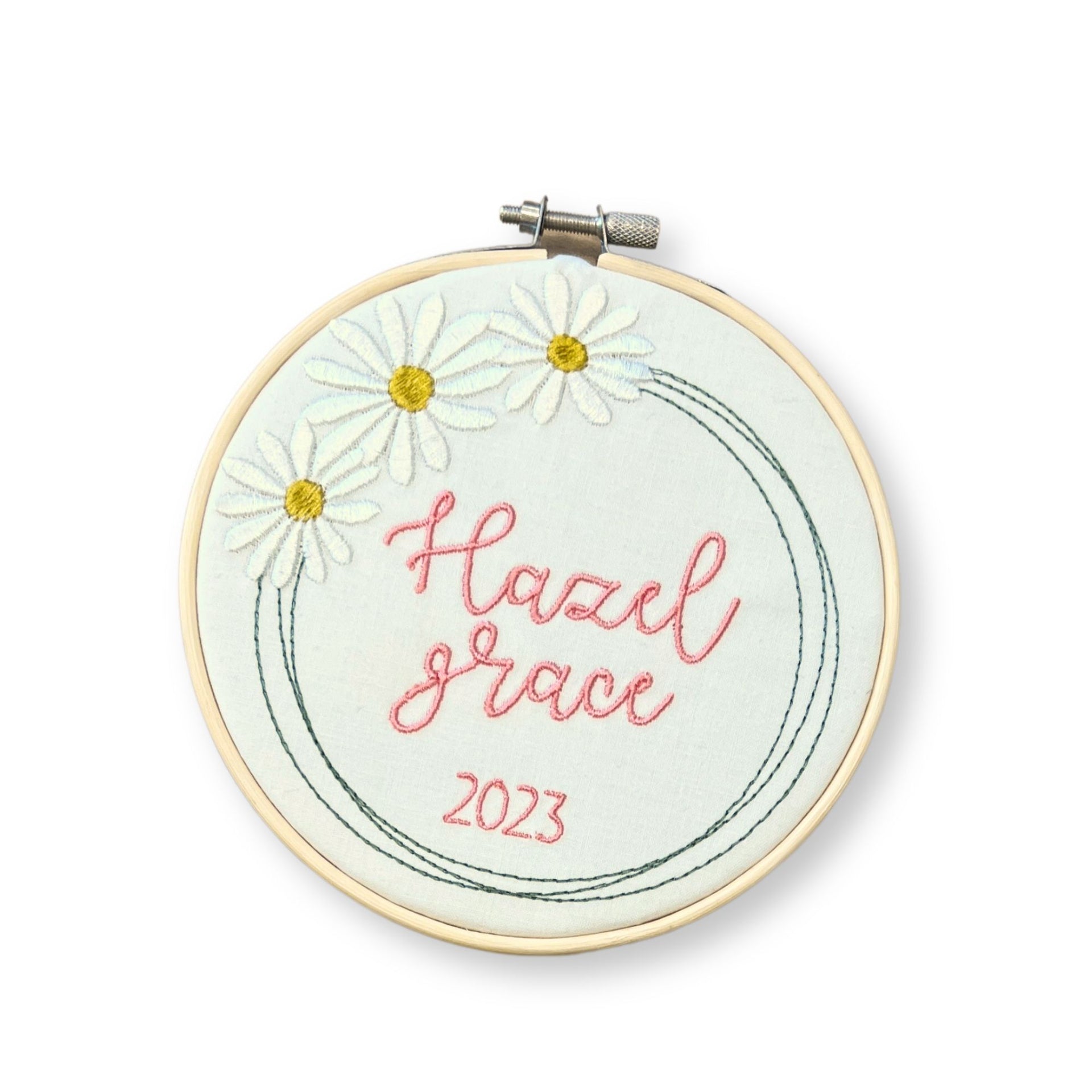 Hoop is 5" inches made from wood. You may choose font and thread color for name. Please include First Name, Middle OR Last name, and Year.