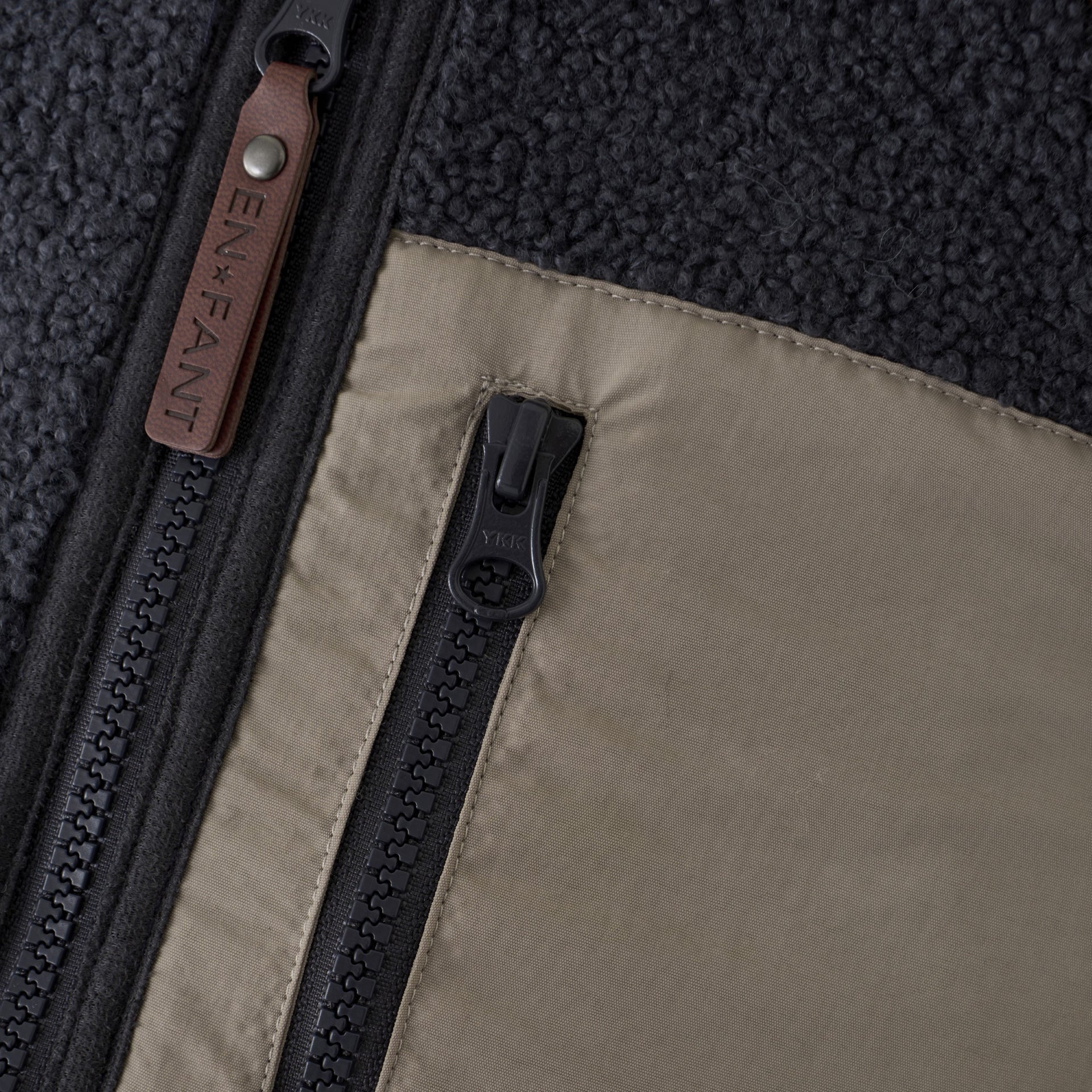 Charcoal jacket with neutral sleeves and side pocket. This jacket has a side pocket with and a zipper down the middle. The teddy jacket will become your littles favorite in between seasons jacket because of the comfiness.