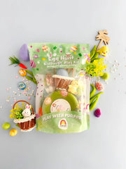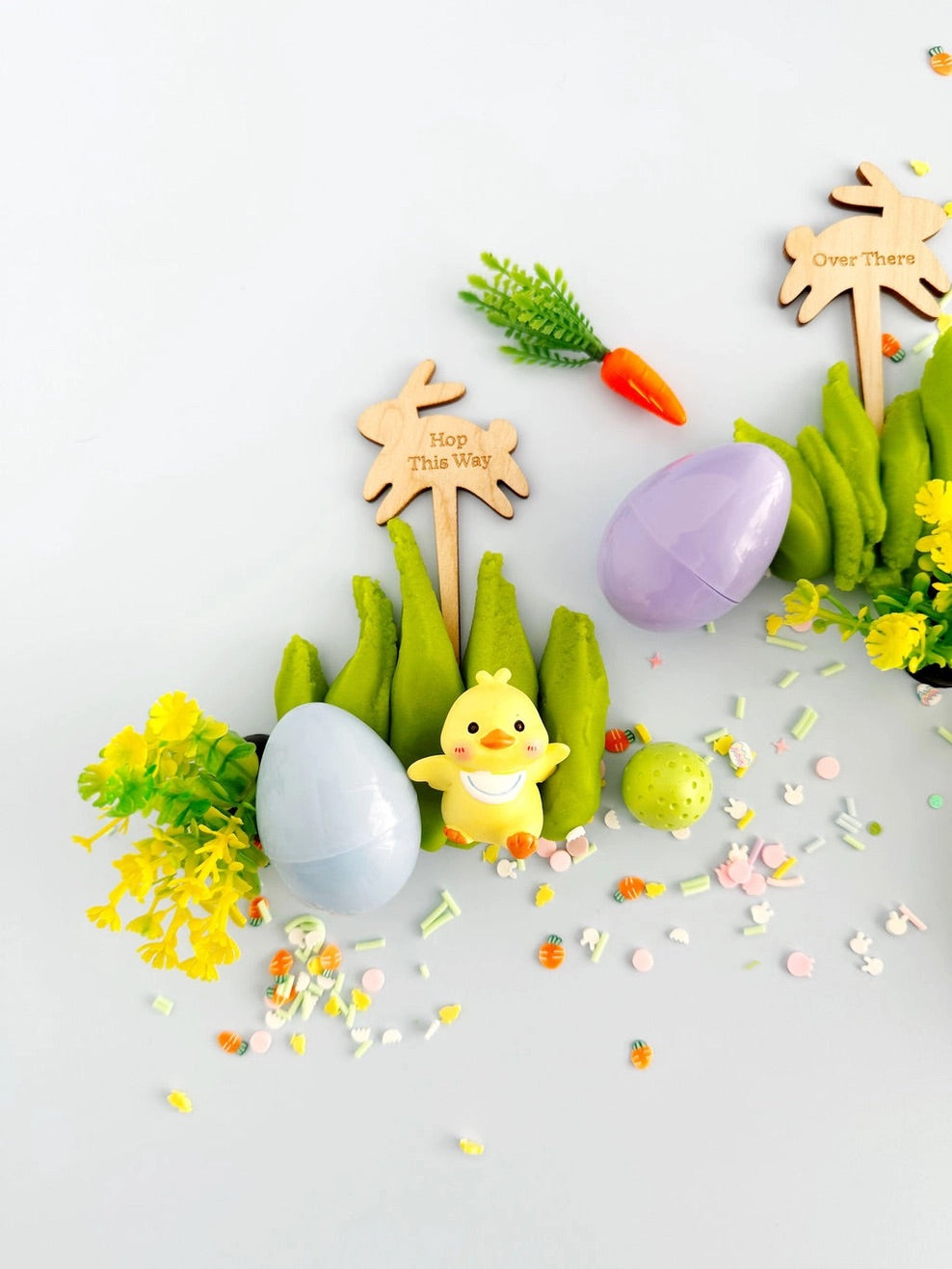 Includes an 8 Ounce jar of Mint (Jelly Bean) KidDough, plus a bunny figurine, chick figurine, basket, Easter eggs charms, sign, easter egg, egg resin figures, foliage, and decorated egg clay fimos.