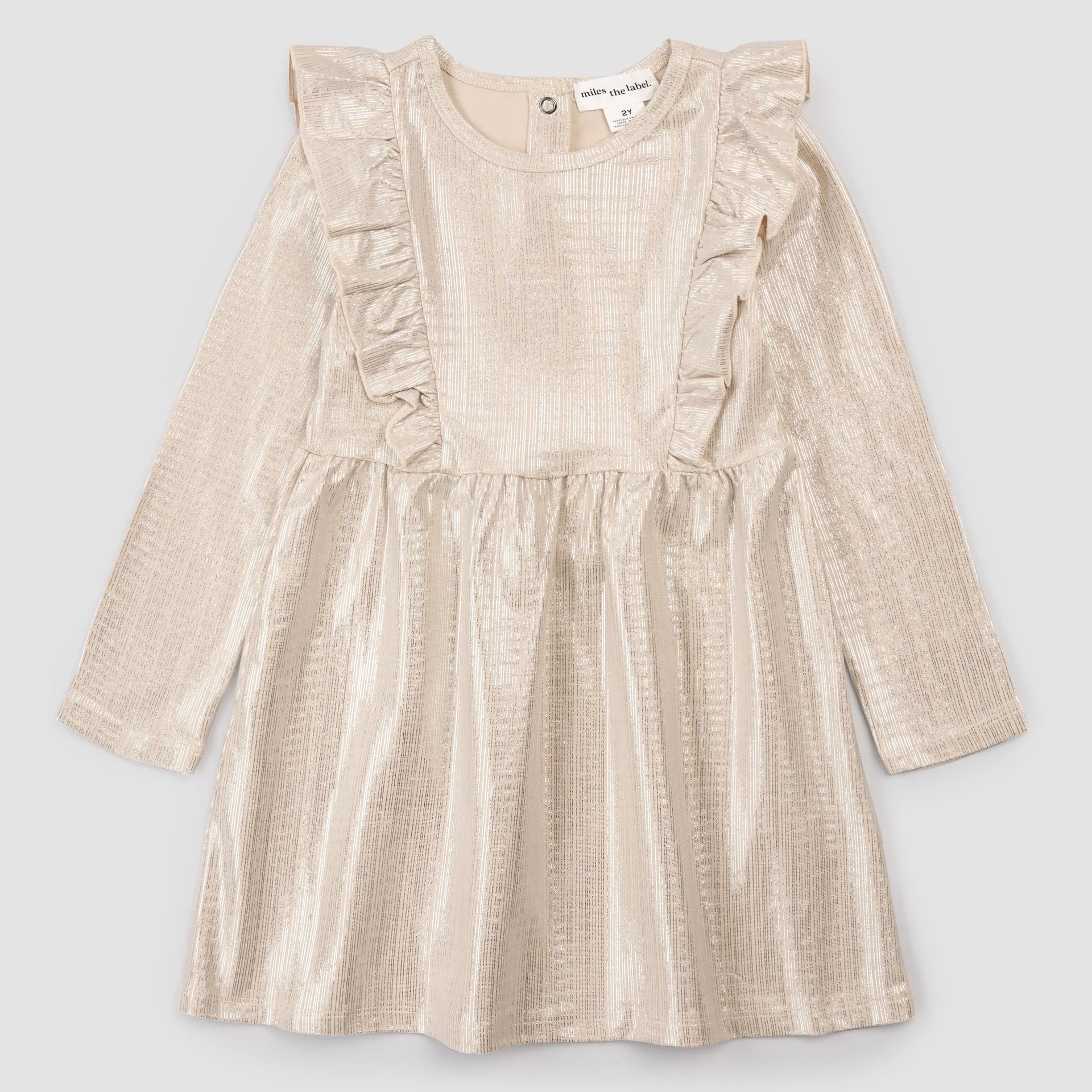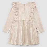 A little shimmer goes a long way to making every day feel like a special occasion. This gold, lamé jersey dress lets her sparkle her way through the day and features a delicate ruffle trim down both sides to add even more fun. A button placket at the back makes the dressy fit easy to pull on and off as she wriggles or dances.