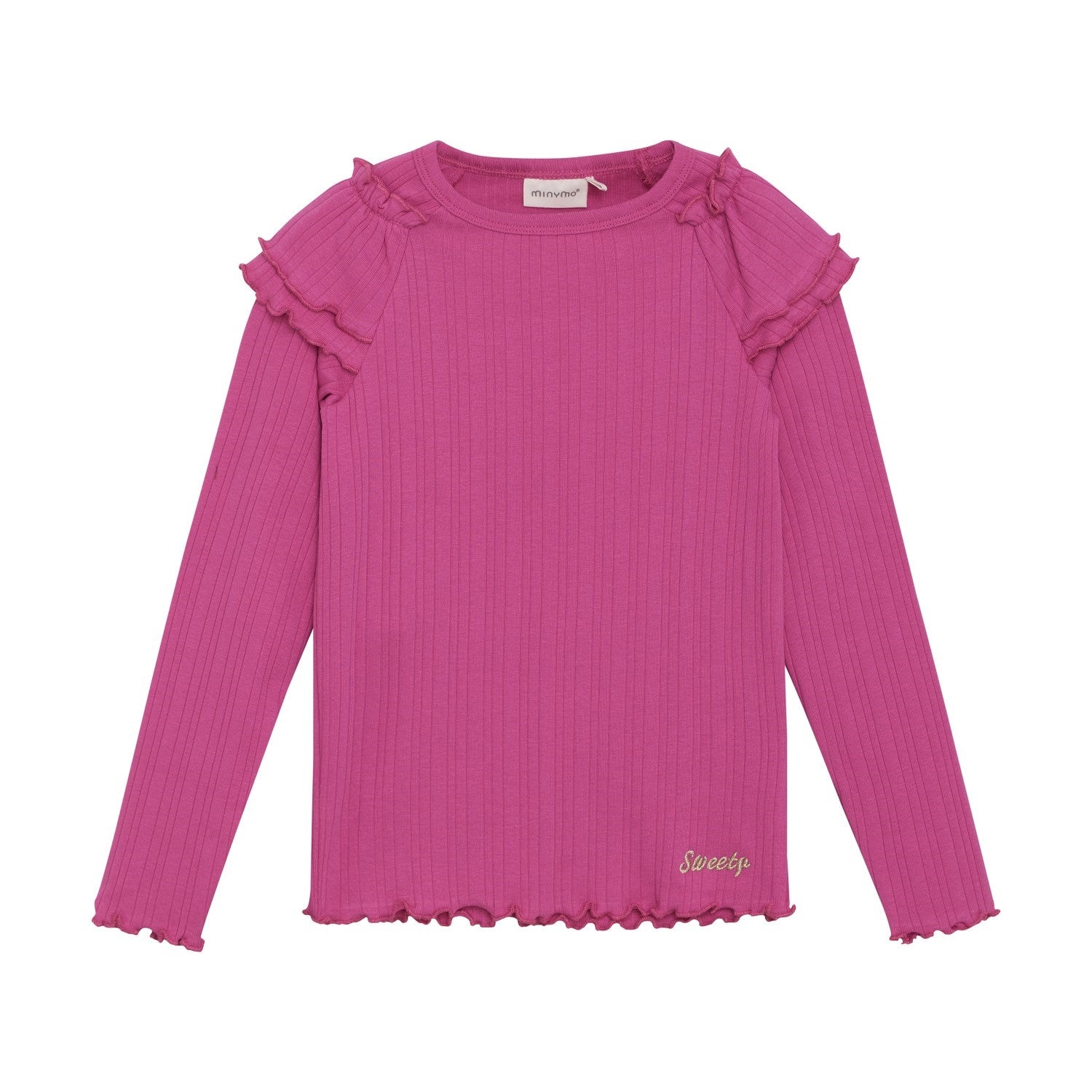 Fuchsia ribbed long sleeve tee with ruffle detailing on the shoulders. A basic that pairs with any style bottom.
