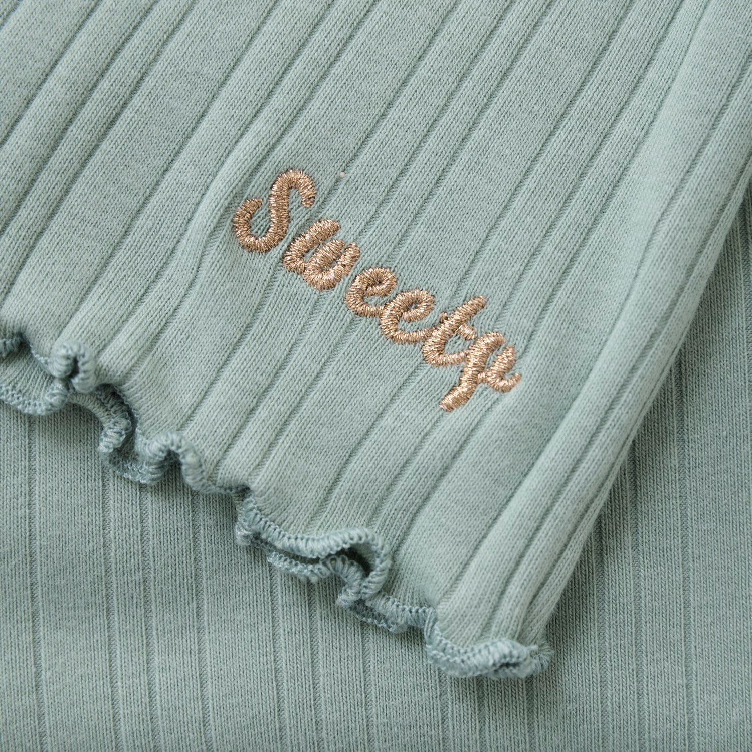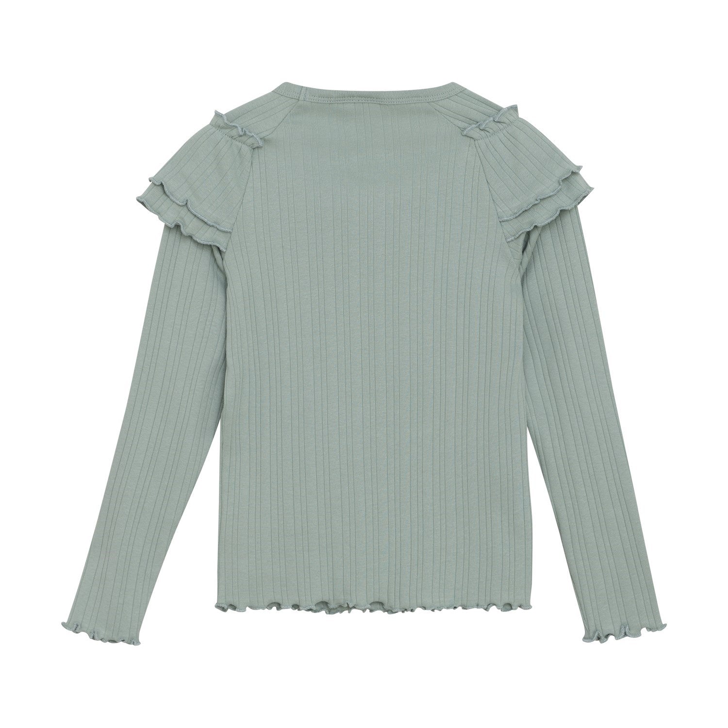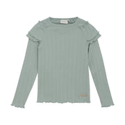 Muted sage ribbed long sleeve tee with ruffle detailing on the shoulders. A basic that pairs with any style bottom.