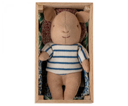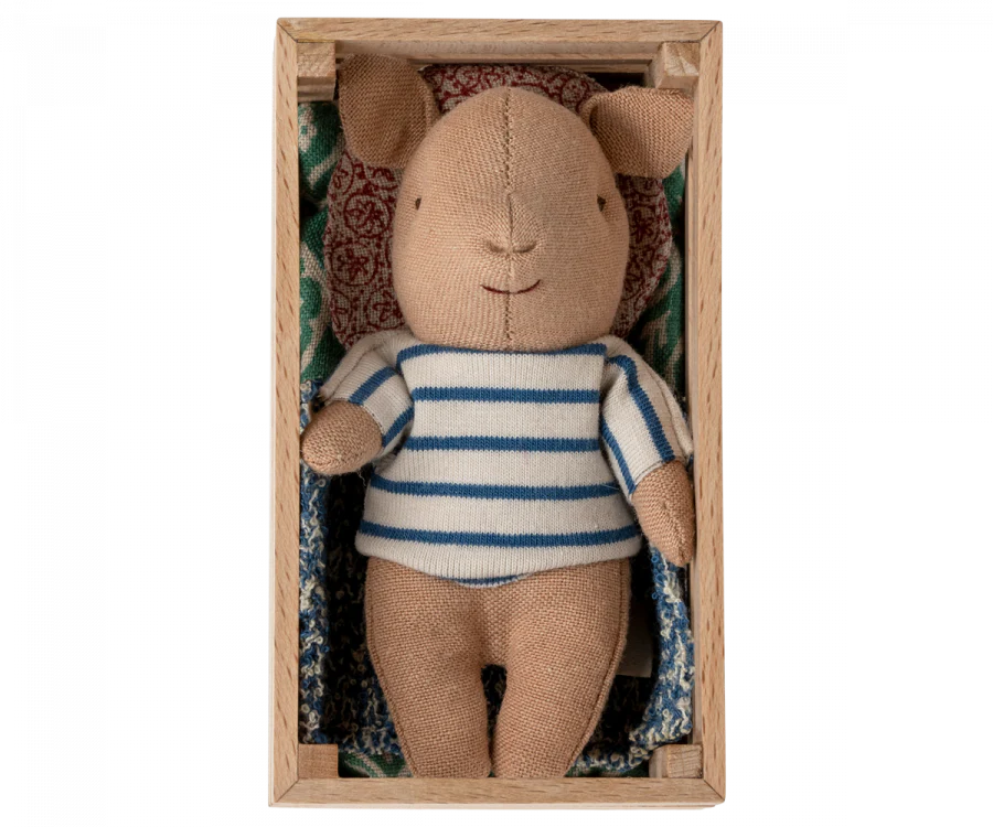 A sweet and cozy playset for imaginations to run wild. This cute little piglet cuddled up in its wooden box with cozy bedding, making a wonderful addition to any story. Add the bigger pigs to expand the playtime!