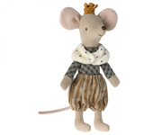 A real prince mouse in a big brother size. He is dressed in his finest clothes with beautiful details and a golden crown. He fits perfectly into the Maileg castle.