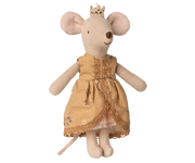 A real princess mouse in a big sister size. She is dressed up in her best dress with beautiful details and a golden crown. She fits perfectly into the Maileg castle.