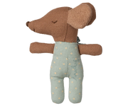 A Maileg favourite, this Baby Mouse comes tucked inside his very own matchbox bed. Dressed in a cosy spotted suit with a blue bow, he rests on soft patterned bedding, ready for sweet dreams. His face is double-sided, with one side sleepy and the other wakey, so you can choose whether he is ready for a peaceful slumber or a day of play.